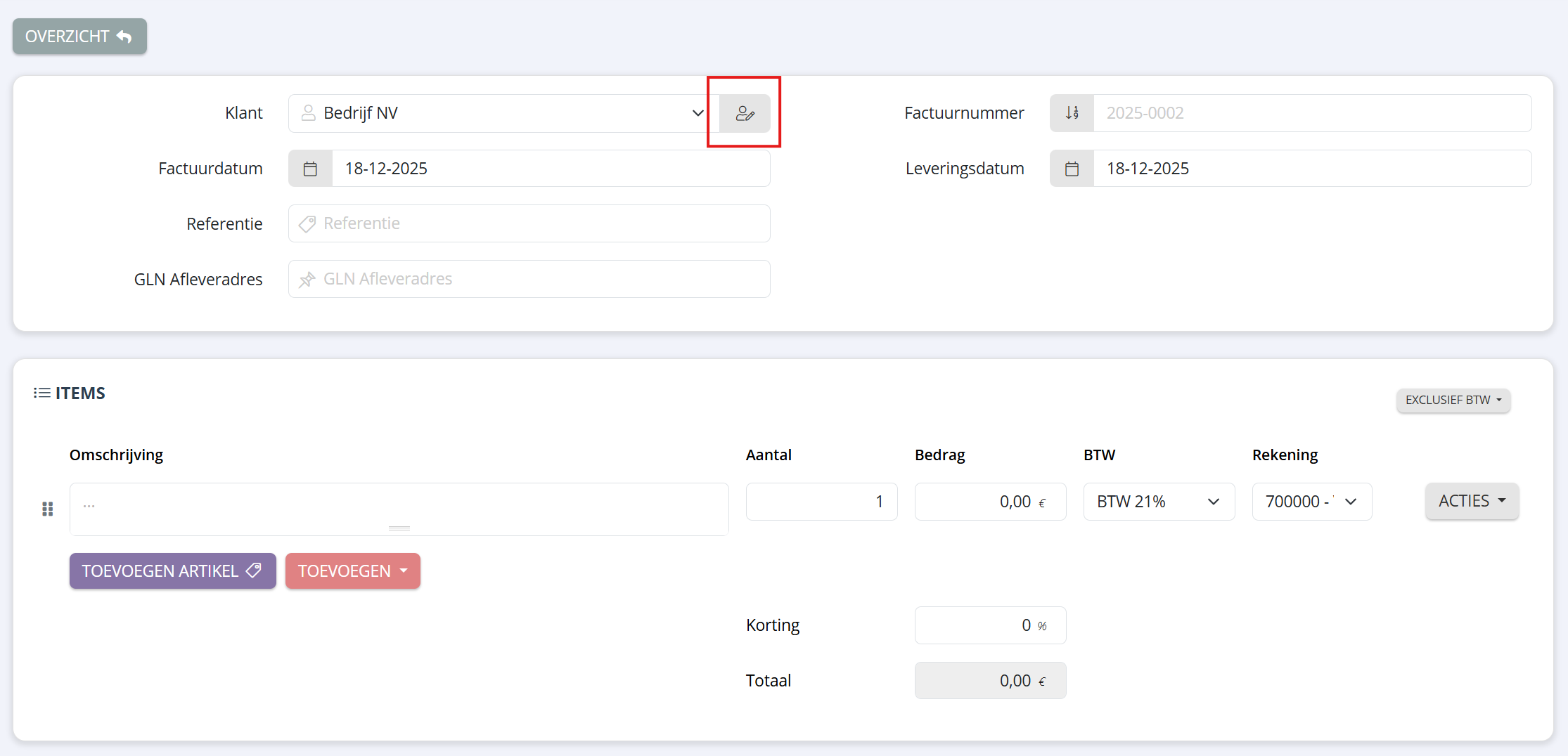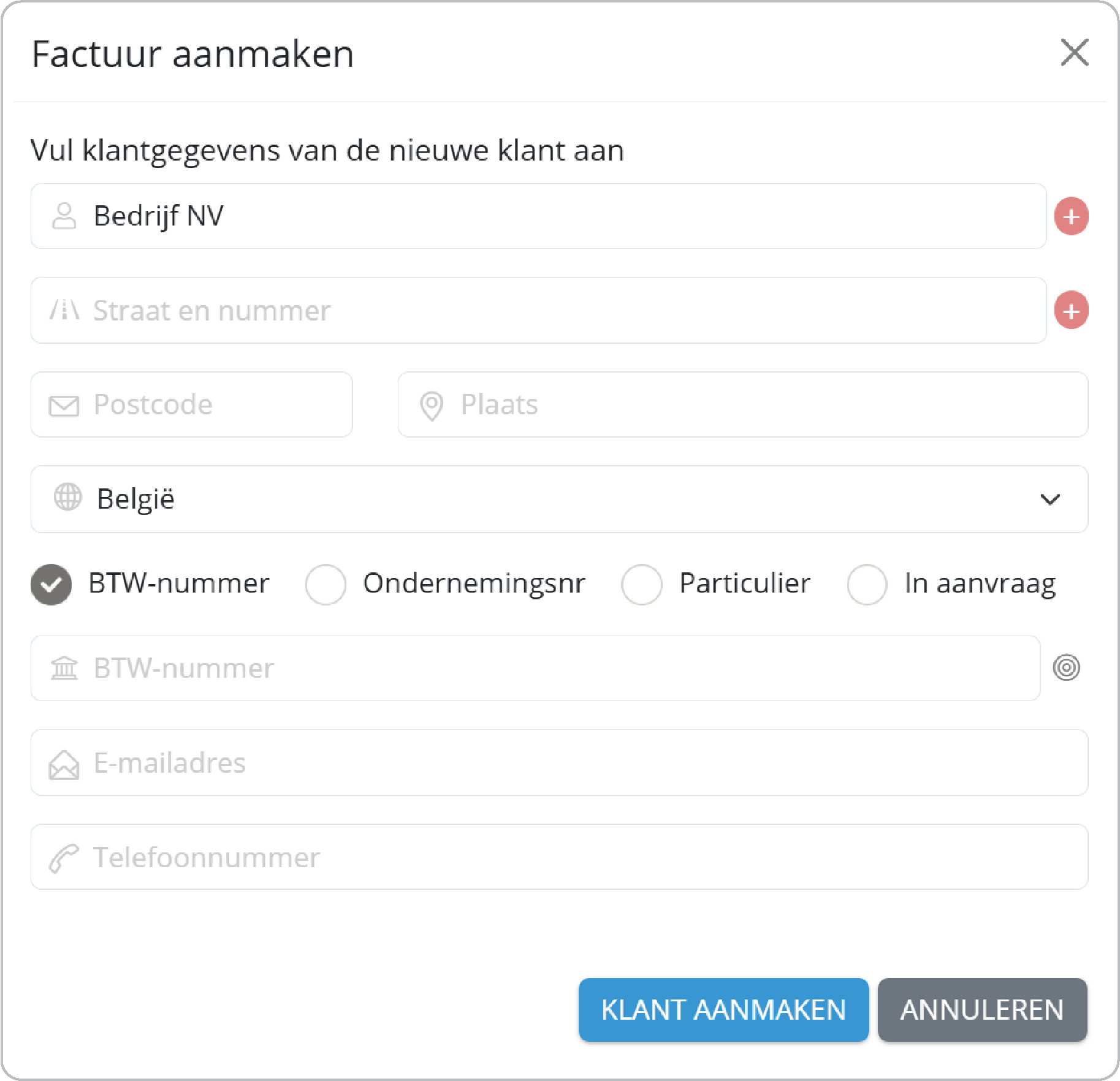 Bij het toevoegen van een nieuwe klant moet je eerst de bedrijfsgegevens invullen, zoals het adres, btw-nummer, e-mailadres en telefoonnummer. Controleer dat alle gegevens correct en volledig zijn. Vervolgens klik je op ‘Klant aanmaken’ om de klant in het systeem op te slaan.