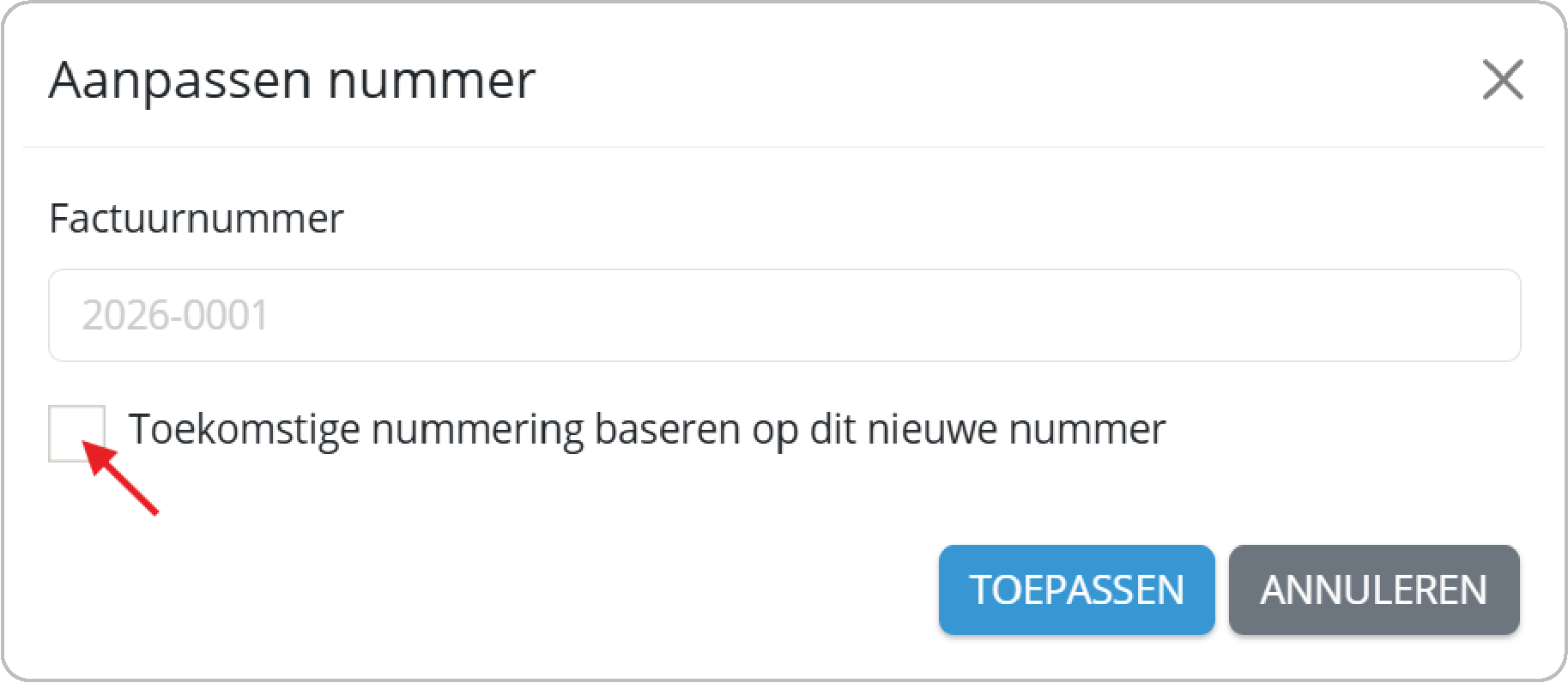 Het systeem zorgt ervoor dat jouw factuurnummers automatisch netjes opvolgen (bijvoorbeeld 2026-0001, 2026-0002, 2026-0003, …). Standaard staat de optie ‘toekomstige nummering baseren op dit nieuwe nummer’ aangevinkt.