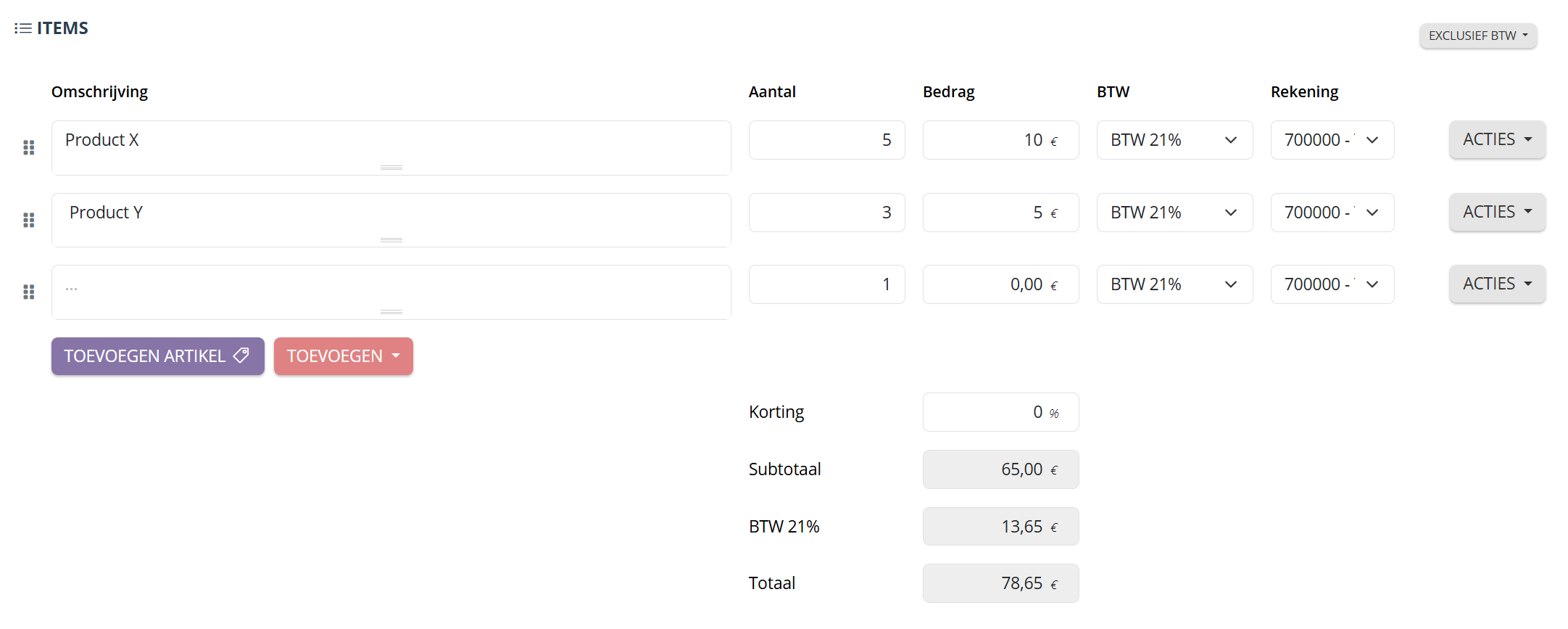 Voeg je omschrijving, aantal, bedrag en BTW-tarief toe