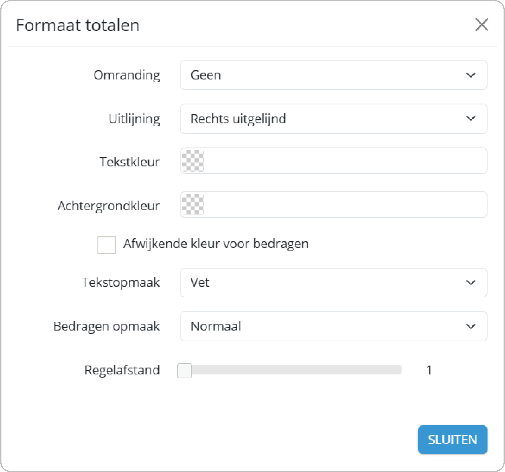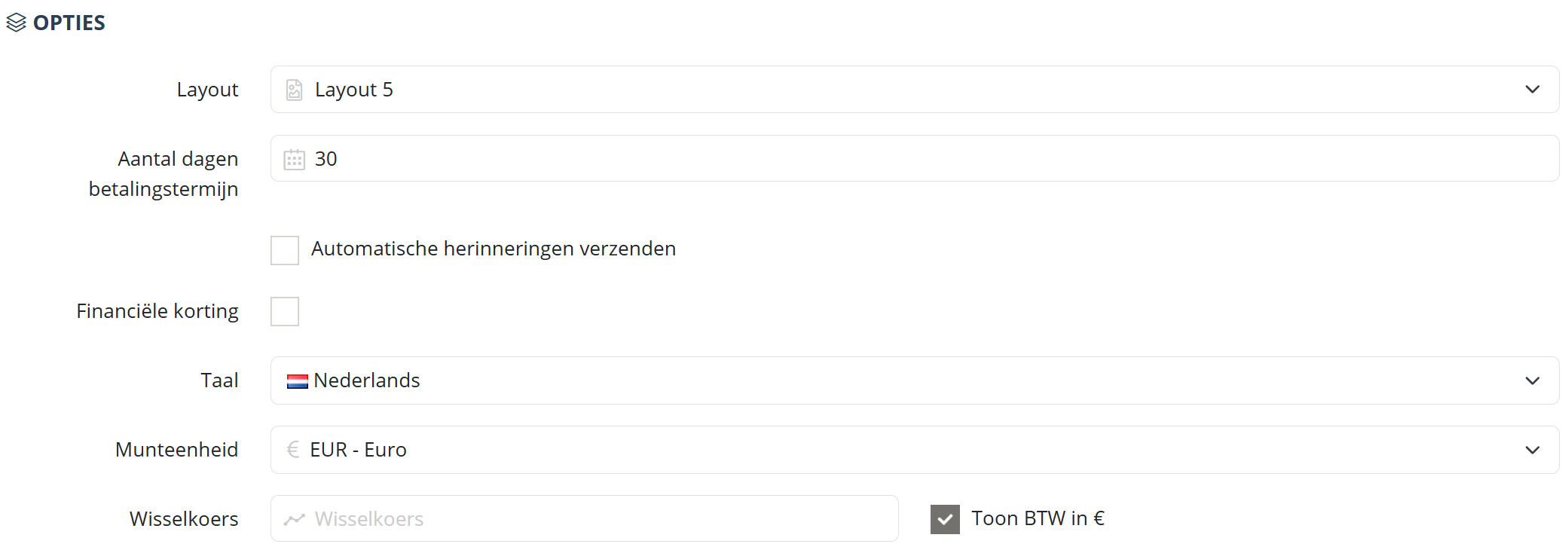 Hier kun je de lay-out, betalingstermijn, automatische herinneringen, financiële korting, taal van de factuur en de munteenheid instellen.