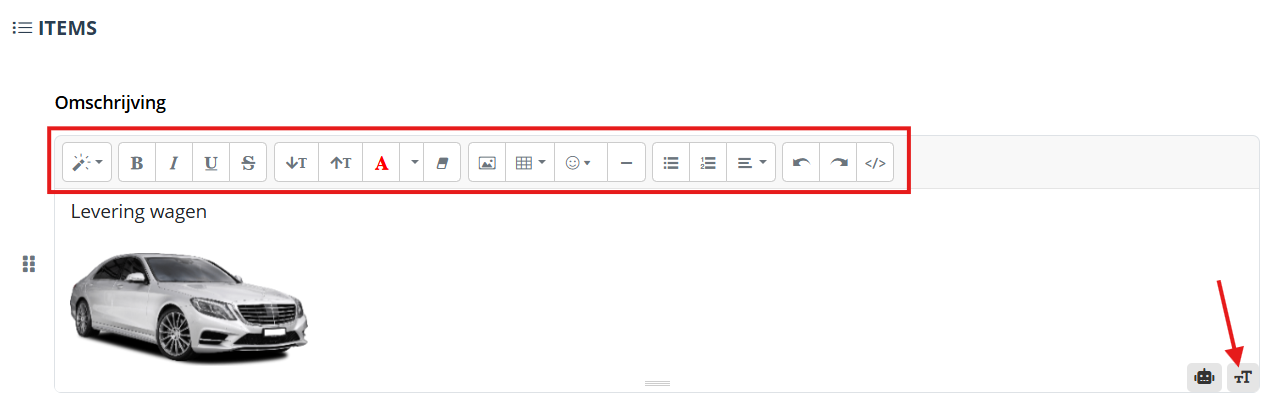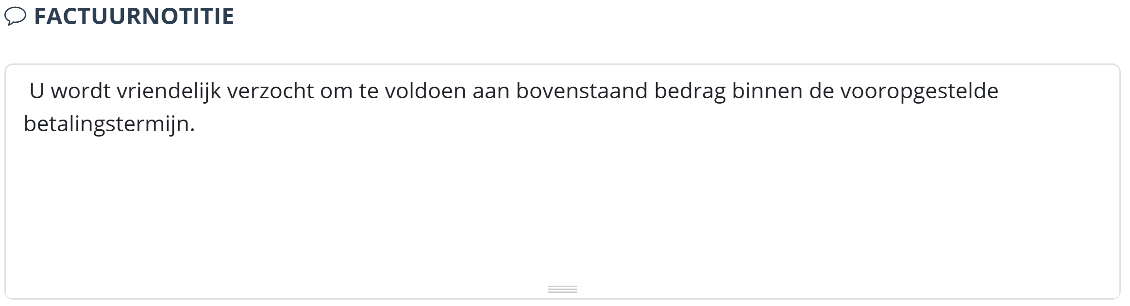 Hier noteer je waarover de factuur precies gaat en kan je gebruik maken van de teksteditor. (wijzig kleur, zet in vetjes, onderstreep, maak kleiner, groter, voeg tabellen, variabelen, afbeeldingen en nog veel meer toe)