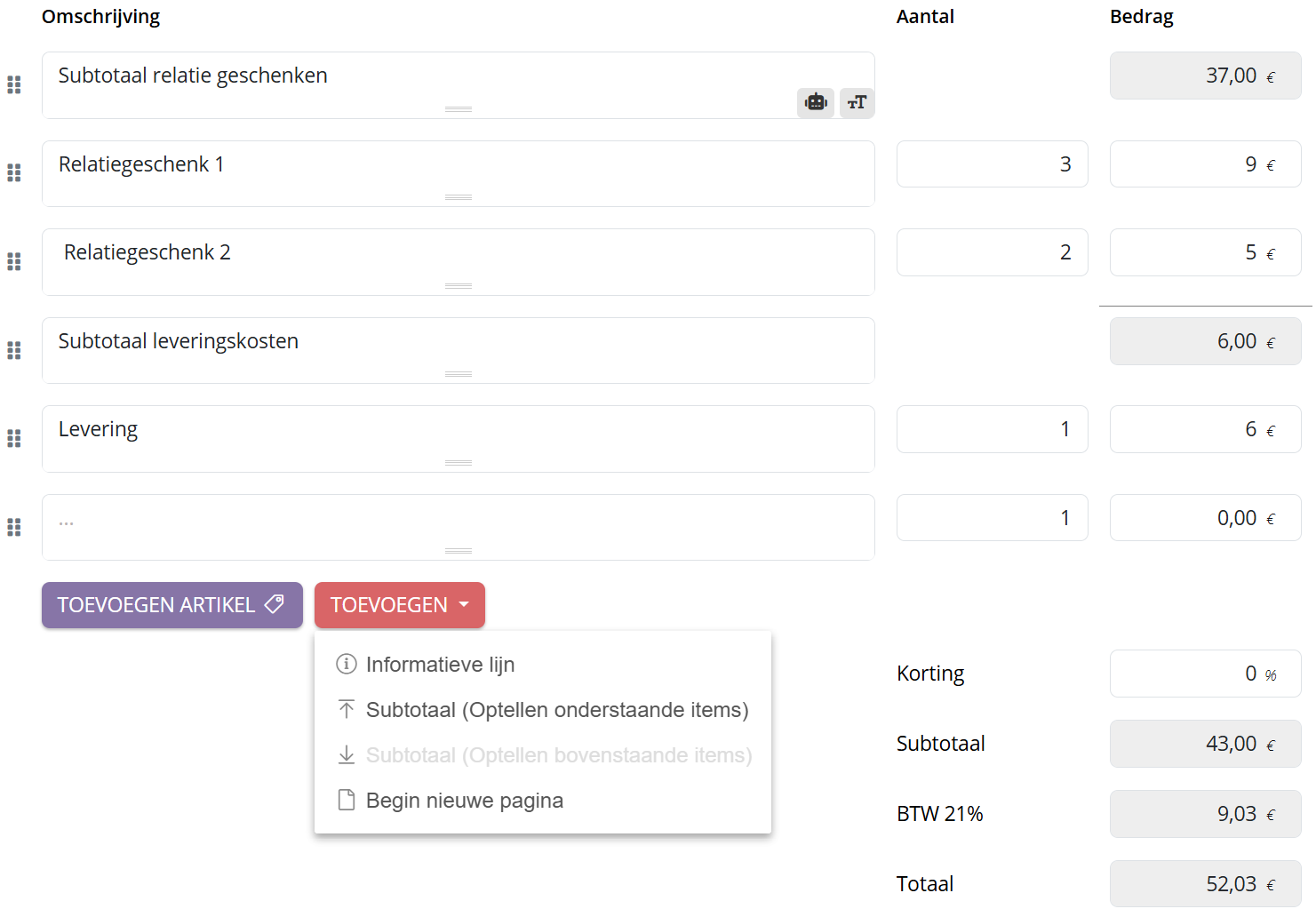 Via de subtotaalfunctie voeg je eenvoudig een subtotaal toe aan de facturen. Hiermee kan de factuur worden ingedeeld in duidelijke onderdelen waardoor de factuur inzichtelijker wordt.