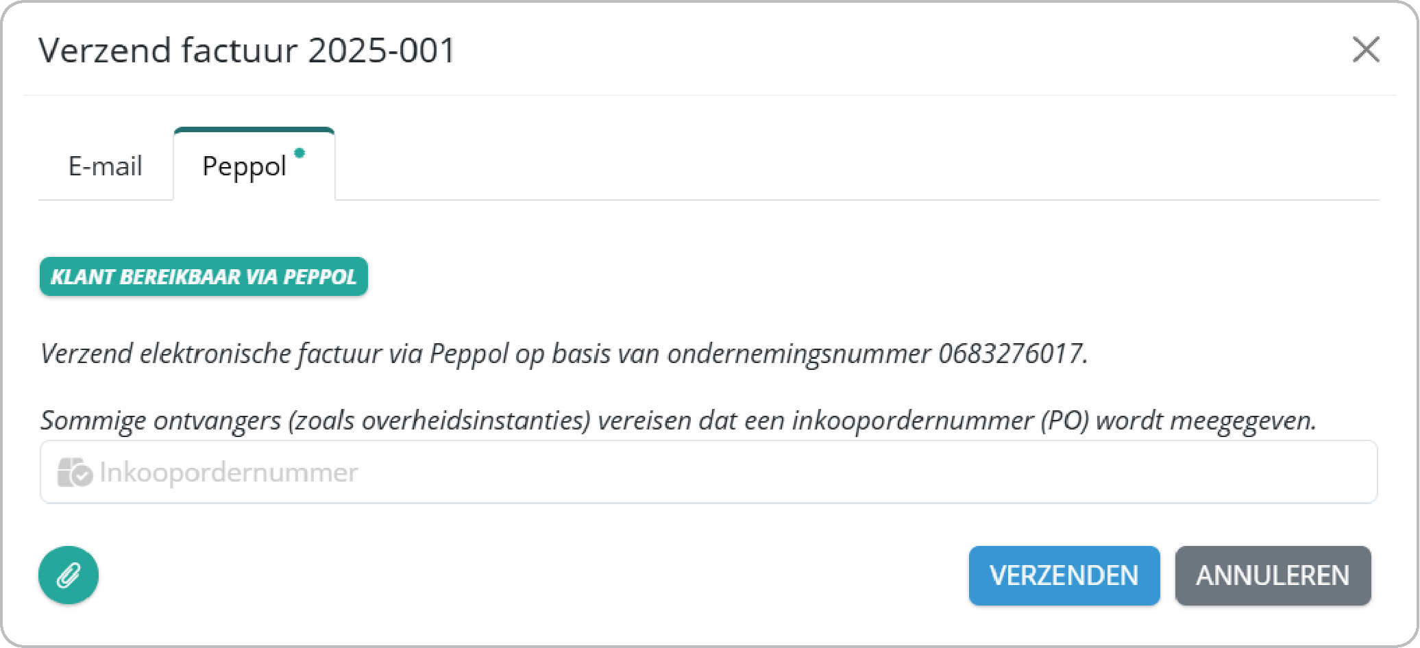 Selecteer vervolgens of je de factuur via Peppol of per e-mail wilt verzenden. Is de klant bereikbaar via Peppol, dan zie je een groen bolletje. Is de klant niet bereikbaar via Peppol, dan wordt dit aangeduid met een rood bolletje.
