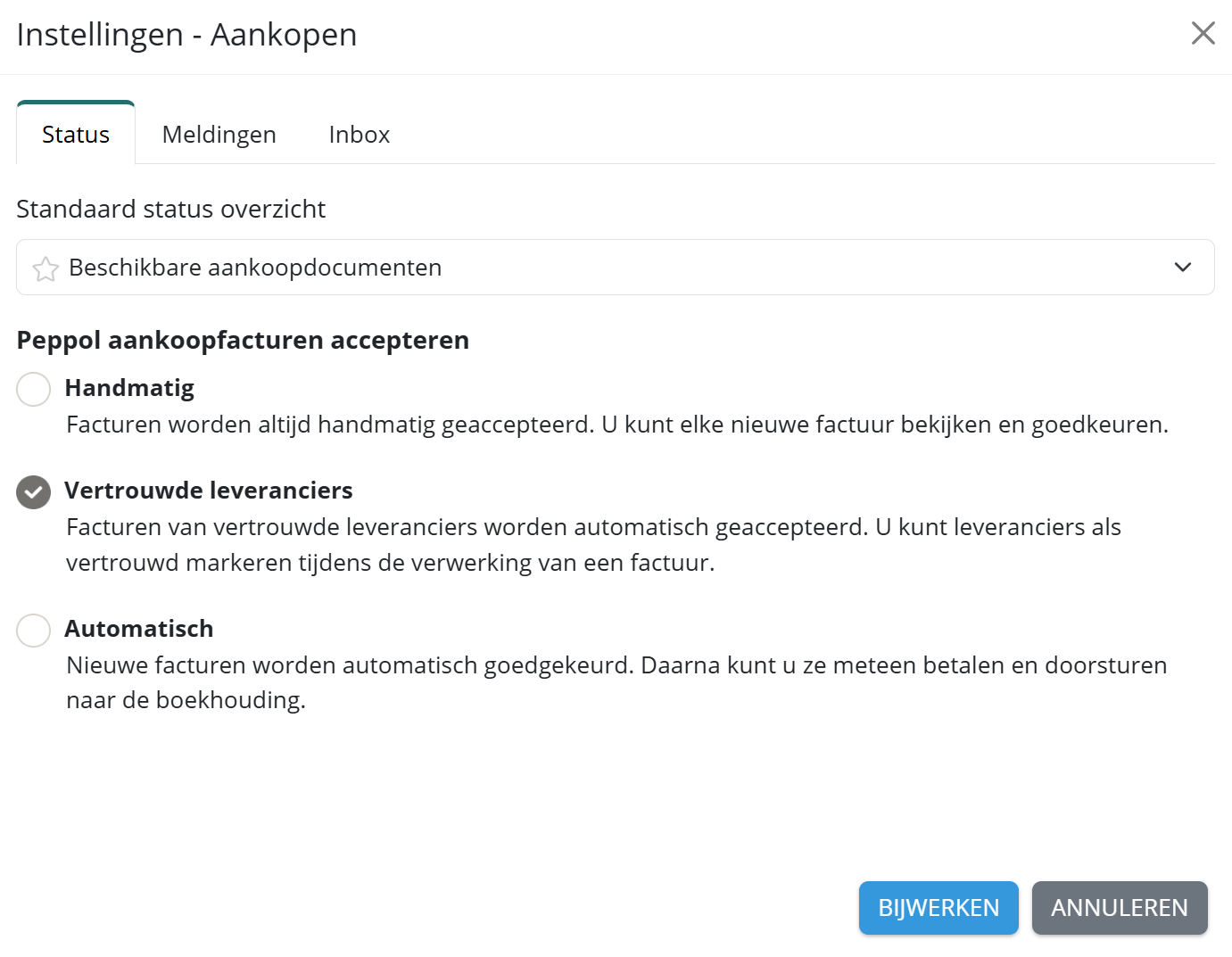 Bij Status bepaal je hoe inkomende aankoopdocumenten standaard worden verwerkt in de Aankopen module. Dit bepaalt de manier waarop nieuwe Peppol-facturen binnenkomen en hoe ze verder worden afgehandeld. Je kunt kiezen of facturen automatisch worden goedgekeurd, of dat je ze eerst wilt nakijken en zelf goedkeuren. Daarnaast kun je aangeven hoe er moet worden omgegaan met vertrouwde leveranciers, zodat facturen van bekende partijen automatisch kunnen worden geaccepteerd.